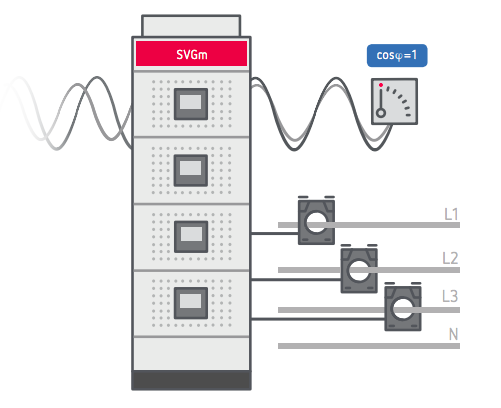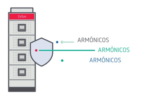 SVGm utiliza electrónica de potencia para compensar la energía reactiva. Al no tener elementos pasivos, el equipo puede instalarse en cualquier tipo de red con alta presencia de corrientes armónicas sin ver afectado su rendimiento